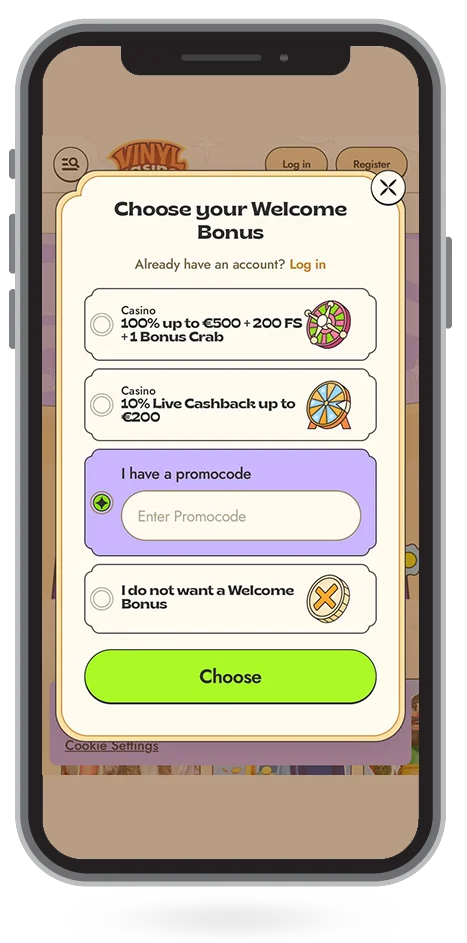 VinylСasino registrering gjennom vår app er en enkel og effektiv prosess som gir deg tilgang til over 10 000 spill i Norge. Med VinylCasino app registrering får du attraktive bonuser, som en 100 % velkomstbonus opptil 5000 NOK pluss 200 gratisspinn, samt ukentlige tilbud som øker vinnersjansene dine. Vårt sikre miljø sikrer at VinylCasino APK registrering er trygt og brukervennlig.
