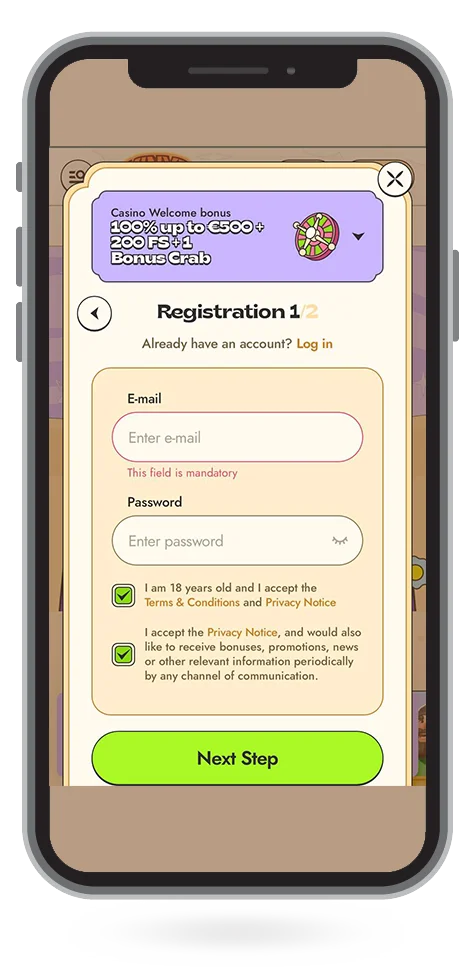- Åpne Vinyl Casino-appen og klikk på «Registrer deg» for å starte VinylCasino registrering.